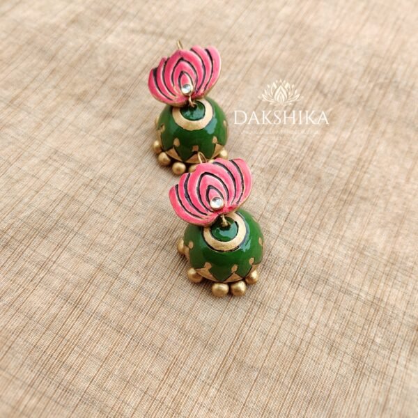 Ambuja -Terracotta- Medium Size Jhumka ( Golden with Green and Pink )