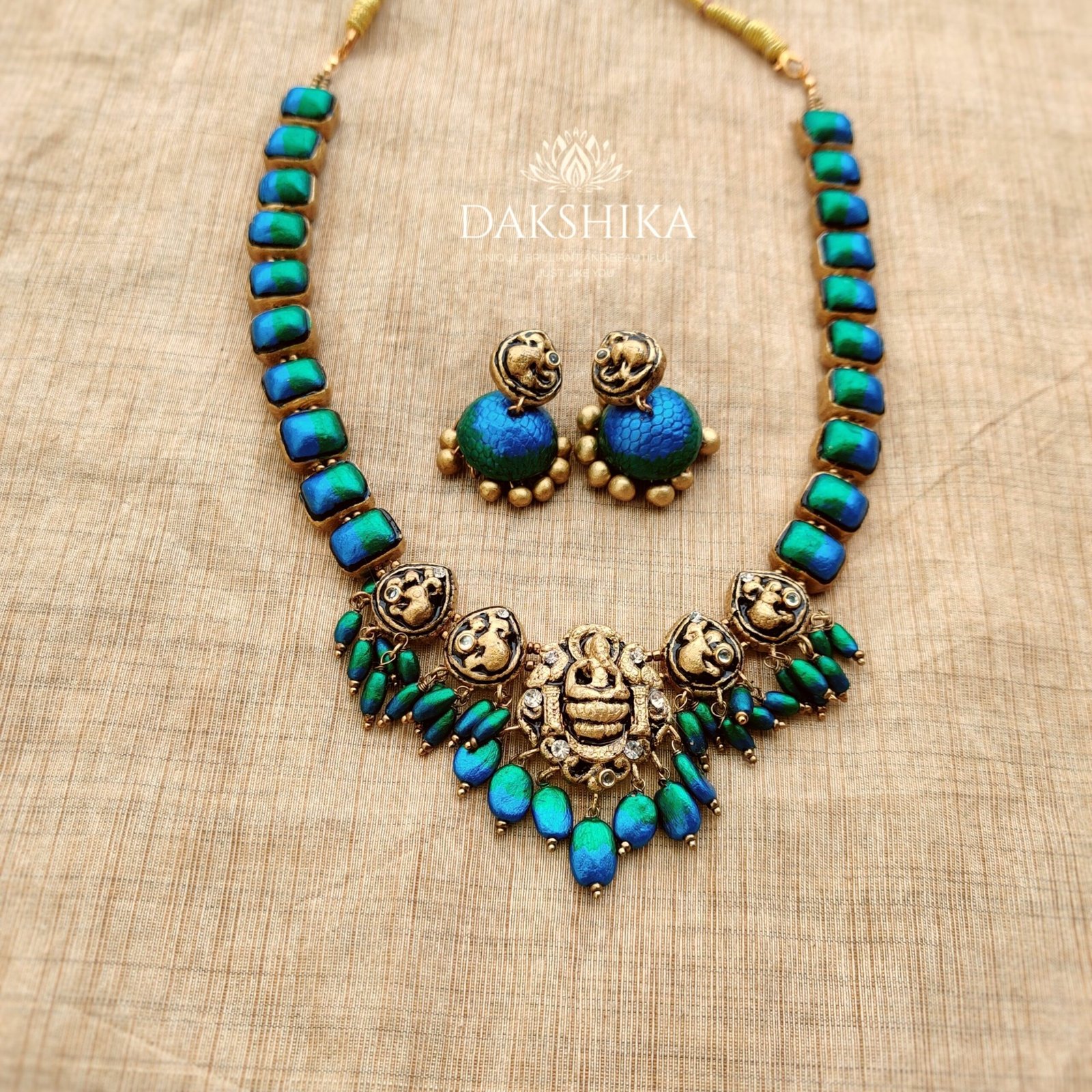 Mayoora- Short Necklace with Medium Size Jhumka (Golden with Peacock blue and green )